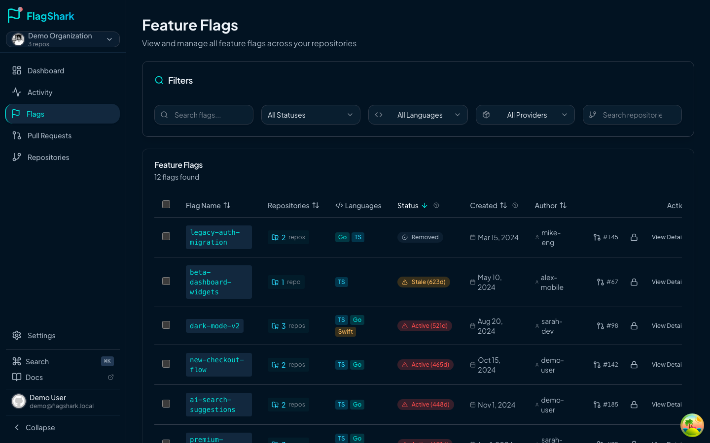 - Flags per repository: Total flag count